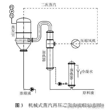 机械式蒸汽再压缩(MechanicalVaporRecompression,MVR或MVC),又称机械热压缩,其流程示意图见图3。MVR采用机械压缩机将蒸发器产生的全部二次蒸气压缩,增加热焓后送到蒸发器的加热室作热源,使料液维持沸腾状态,而加热蒸汽本身冷凝成水。