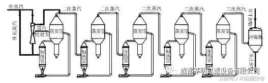 多效蒸发(MultipleEffectEvaporation,MEE)是将几个蒸发器连接起来操作,前一效蒸发器产生的二次蒸汽作为后一效蒸发器的热源,以提高热能利用效率,图1为五效蒸发的流程简图。MEE的优点是进水预处理简单;应用较灵活,既可以单独使用,也可以与其它方法联合使用;系统操作安全可靠。