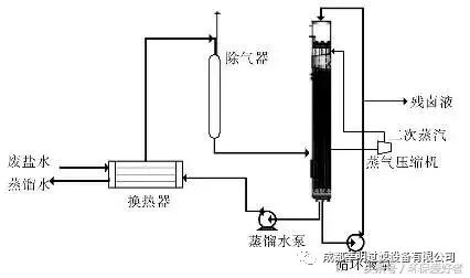 待处理的高含盐废水首先进入换热器预热,再经过除气器,脱除水里的氧气和二氧化碳及不溶气体后进入浓缩器底槽,和在浓缩器内部循环的盐水混合;混合盐水被泵至换热器管束顶部水箱,通过换热管顶部的盐水分布件流入换热管内,呈均匀的薄膜状下降至底槽,同时吸收管外蒸气的热能而蒸发;管内蒸汽和未蒸发的盐水一起下降至底糟,底糟内的二次蒸汽经压缩机增压后进入浓缩器的换热管外,对沿换热管内壁下降的盐水膜加热,使部分盐水蒸发,压缩蒸汽则在换热管外壁上冷凝成蒸馏水;蒸馏水被泵经换热器后进储罐待用,同时给新流入的废水加热;底槽内的部分盐水被排放,以控制浓缩器内盐水的浓度。